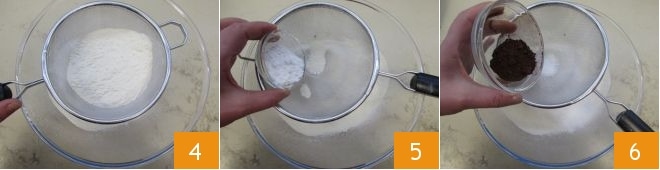 In a separate bowl, sift the flour 4, baking powder 5, and cocoa 6.