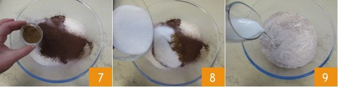 Then add the ground cinnamon 7, granulated sugar 8, and milk at room temperature 9.