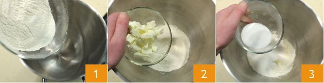 To make the sweet Carnival ravioli, pour the sifted flour 1, cubed butter 2, sugar 3, into the bowl of a stand mixer with a paddle attachment (or in a bowl if kneading by hand),
