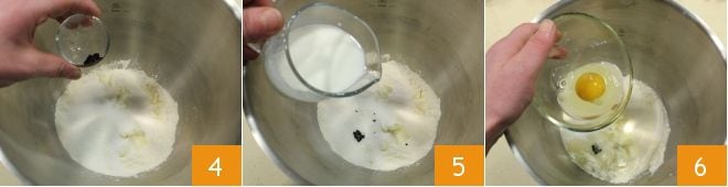 the egg 4, vanilla seeds 5, milk 6, and a pinch of salt