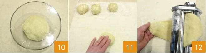 that you will cover with plastic wrap and let rest for half an hour in a cool place 10. Take the dough, divide it into portions (about 5 oz), flatten them 11, and work them with a pasta machine 12 (or a rolling pin) to obtain a thickness of 1/16 inch, which generally corresponds to the penultimate thickness of the pasta roller, for best results consult the cooking school guide how to roll out dough. If the dough tears during processing, flour it, fold it in three, and pass it through the machine again until it is smooth and compact, passing it from the thicker rollers to the thinner ones.