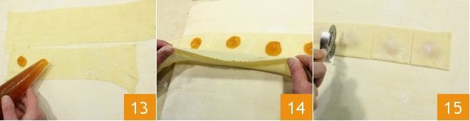 Place a sheet on a work surface and place small mounds of filling (a scant teaspoon) on it at a few inches apart from each other, to make this operation easier you can transfer the filling to a piping bag 13 to portion the filling better: you can choose between a jam of your choice or Nutella. Brush the edges of the sheet and the surface between one mound of filling and another with egg white, then fold the sheet lengthwise closing it like a book 14, press the dough around the filling to remove the air, then with a fluted pastry wheel, cut out the ravioli 15. Continue in this way until the dough is used up.