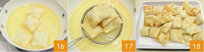 Pour some seed oil into a deep pan and when it is hot but not boiling, immerse 2-3 ravioli at most at a time 16, turning them on both sides and draining them 17 as soon as they are golden. Place the ravioli on kitchen paper 18 to remove excess oil and then once dry, dust them with vanilla powdered sugar. Serve the sweet Carnival ravioli warm or cold.