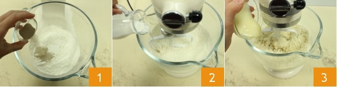 To make the sweet Easter bread, sift the all-purpose flour and bread flour (alternatively, you can use flour 0) into the bowl of a stand mixer fitted with the paddle attachment (if you don't have a stand mixer, you can knead by hand), add the dry yeast (or 12 g of fresh baker's yeast) 1, pour in the milk 2 and water, and start the machine at medium speed, incorporating the condensed milk 3.