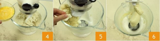 Also add the eggs, continuing to knead 4. Replace the paddle with the dough hook and continue kneading, adding the salt and butter in pieces a little at a time 5, waiting for each piece to be incorporated before adding another, continue kneading until the dough detaches from the sides, wrapping around the hook 6.