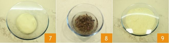 Form a ball with the dough, place it in a bowl, cover it with plastic wrap 7, and let it rise in a warm place (like an turned-off oven with the light on) until it has doubled in volume, it will take about a couple of hours. Meanwhile, soak the raisins in water 8. Take the risen dough 9,