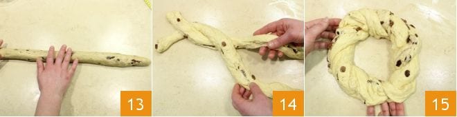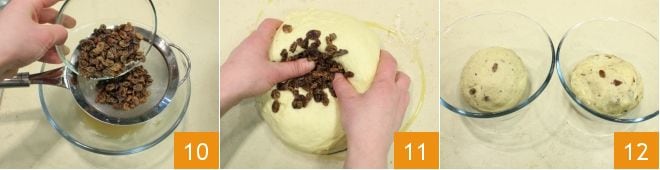 drain the softened raisins 10 and incorporate them into the dough 11. Divide it into two equal dough balls 12,