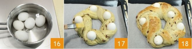 In a saucepan, cook 5 white eggs 16 until they are hard-boiled. Once ready, let them cool, then place them between the braids so they are well fixed and equidistant. Brush the surface of the sweet with a beaten egg and bake in a preheated static oven at 356°F for 40 minutes (or in a fan oven at 320°F for 30 minutes). Once cooked, remove the sweet Easter bread from the oven, let it cool slightly, and then serve it by cutting it into slices.