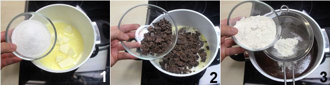 To make the sweet Halloween tombs, start by preparing the chocolate pudding (Chocolate pudding with strawberries and cream for the full recipe): put the butter cut into pieces in a saucepan, melt it over low heat, and add the sugar 1. Add the previously chopped dark chocolate 2 and mix with a whisk. When the chocolate is melted, gradually add the sifted flour 3 and keep stirring to make sure everything is well blended.