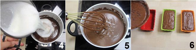 Pour the milk, which you heated, all at once into the chocolate mixture 4 and cook the mixture over low heat, stirring constantly, until it thickens 5. Then let it simmer for 5 minutes, turn off the heat and pour the pudding into 8 single-serving rectangular molds with a capacity of about 3 oz 6. Allow to cool and place the molds in the refrigerator for at least a couple of hours until the pudding sets well.
