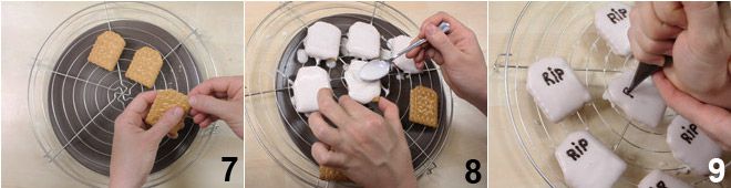 Meanwhile, prepare the tombstones: trim the corners of the upper end of all the cookies 7, then make an icing by dissolving powdered sugar with about 2 teaspoons of boiling water in a bowl and mixing until you get a smooth and thick glaze. Cover the cookies with the glaze, letting them drip on a rack, and let them dry well. Melt the dark chocolate in a double boiler (or in the microwave), transfer it to a piping bag, and decorate each cookie with the initials RIP (rest in peace).