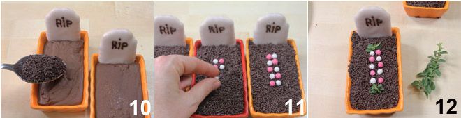 At this point, you can complete the sweet tombs: insert a cookie-tombstone at the end of each pudding-tomb and cover the surface with a spoonful of chocolate sprinkles 10. Arrange the candies in the center in two rows, alternating colors 11, and finally decorate with fresh oregano (or mint) leaves 12: the sweet Halloween tombs are ready!