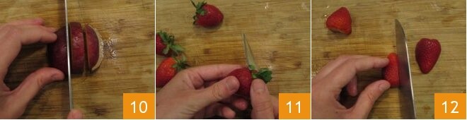 Continue with the plum, slicing it 10. Remove the leaves from the strawberries 11 and cut them in half 12.
