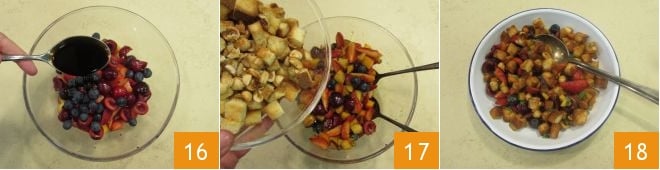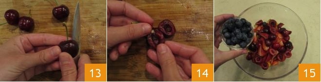 Finally, cut the cherries in half 13 and pit them 14. Now everything is ready to assemble the sweet panzanella: in a large bowl, add all the chopped fruit, including whole blueberries 15,