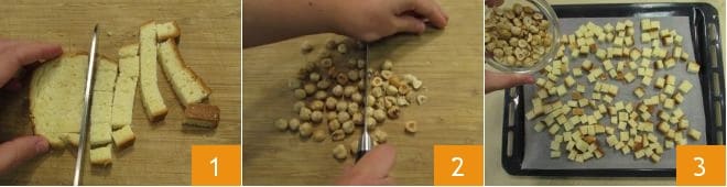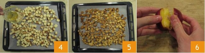 To make sweet panzanella, first cut the brioche bread into cubes of approximately 1.5 cm (about 0.6 inches) 1 and roughly chop the hazelnuts 2. Line a baking sheet with parchment paper and spread the brioche cubes and chopped hazelnuts on top 3.
