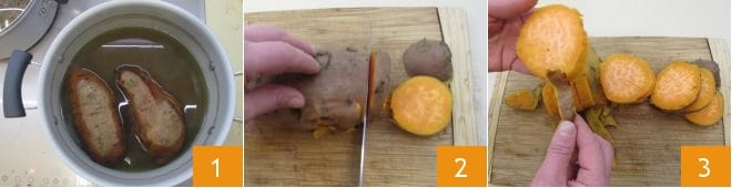 To make sweet potato gnocchi, boil the potatoes with the skin for 20 minutes 1, they should be cooked only on the outside, they will finish cooking in the oven which will dry them out to prevent them from releasing water into the dough. Once cooked, drain the potatoes and cut them into slices about 0.4 inches thick 2, remove the skin 3.