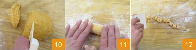 Then, with a dough scraper, divide the dough into pieces 10 and create rolls about 1 inch thick 11, start cutting your gnocchi and place them on a surface 12 or a floured tray.