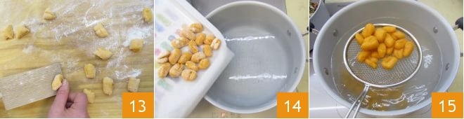 Finally, make the characteristic ridges of the gnocchi by sliding each gnocco on a gnocchi board 13 or a fork and pressing a bit, but not too much. The gnocchi are ready to be boiled: place a pot full of salted water on the stove and bring it to a boil, drop in the gnocchi 14 and cook them for a few minutes, drain them when they start to emerge on the surface 15. Your gnocchi are ready to be accompanied by the sauces and gravies you prefer 16!