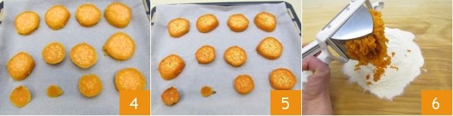 Place them on a baking tray covered with parchment paper 4, cook them in a preheated convection oven at 356°F for 30 minutes (or in a static oven at 392°F for 20 minutes). Once cooked 5, mash the potatoes with a ricer to reduce them to a puree and add them to the sifted flour on a work surface 6, add a pinch of salt.