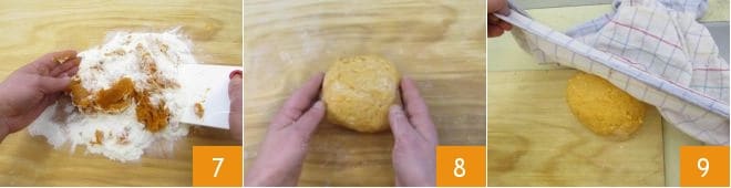 At this point, you can work the dough 7 until you get a compact mixture, shape it into a loaf 8, and cover it with a cloth 9.