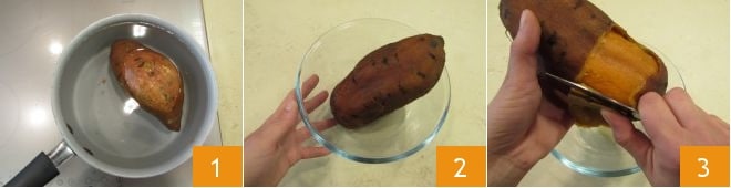 To make the sweet potato pancakes, first, boil the sweet potato for about 20 minutes 1, or until it is soft. Then drain it 2 and peel it 3.