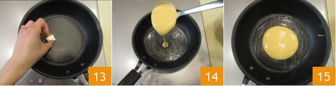 Grease a non-stick pan with a little butter 13 and heat it on the stove. Once it's hot, pour a ladle of batter 14; it will spread on its own, creating the classic pancake shape 15.