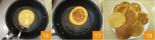 As soon as small bubbles appear on the surface 16, it's time to flip the pancakes 17. Cook them on the other side until they are golden underneath. Then, as you cook them, transfer the pancakes to a serving plate 18.