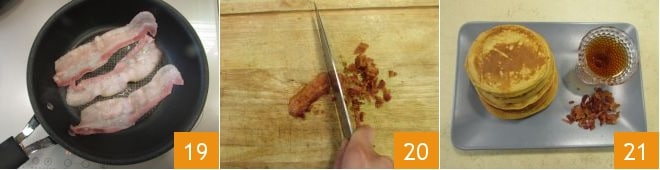 Once you have cooked your pancakes, lightly clean the pan and put it back on the stove. Place the bacon slices and cook them until they are crispy 19, turning them occasionally. Once the bacon is crispy, chop it with a knife 20 and serve the sweet potato pancakes with maple syrup and crispy bacon 21, or with your preferred toppings!