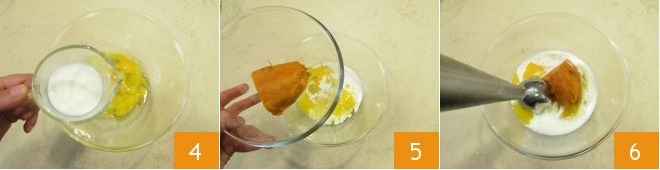 In a bowl, add the eggs along with the milk 4, add the cooked sweet potato 5, and blend everything with an immersion blender 6.