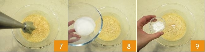 until you get a smooth, lump-free mixture 7. Then add the sugar 8 and the baking powder 9.