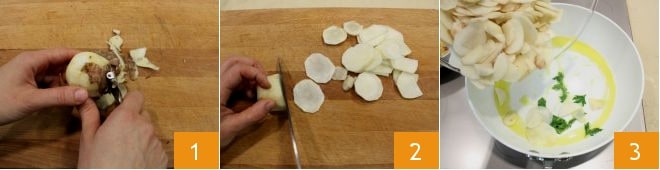 To prepare the crusted swordfish with Jerusalem artichoke purée, start by peeling the Jerusalem artichokes 1, then slice them 2. In a pan, sauté the garlic with a drizzle of oil and parsley leaves, then add the Jerusalem artichoke slices 3 and cook over low heat for about 20 minutes, adding vegetable broth from time to time to aid cooking.