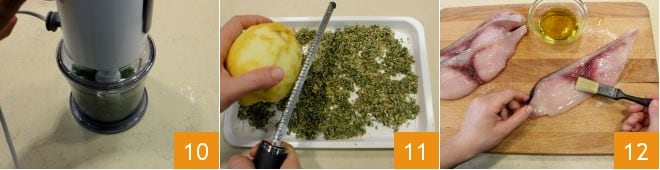 Blend everything 10 to reduce it to a sandy mixture to pour onto a tray and season with untreated lemon zest 11. Brush both sides of the swordfish slices with olive oil 12