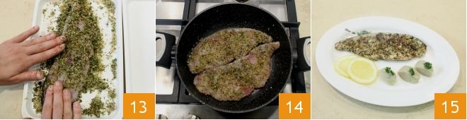 Place one slice of fish at a time in the breading and massage the surface to distribute it 13. Heat a large pan on the stove, and when it is very hot, start cooking the swordfish slices 14: a couple of minutes per side will be enough for the outside to become crispy while the meat inside remains soft and juicy. Once cooked, turn off the heat and divide a crusted swordfish slice and the Jerusalem artichoke purée onto serving plates 15.