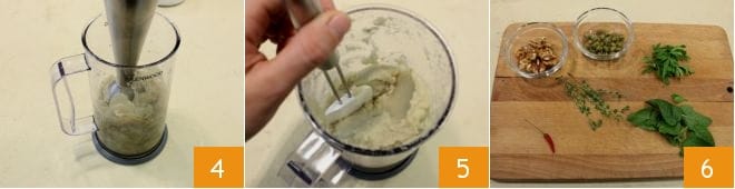 Once cooked, blend it with an immersion blender 4 to obtain a creamy and homogeneous purée 5. Set aside and continue with the swordfish: prepare the aromatic herbs, walnuts, and capers drained from the preserving liquid 6: these will be used to create the crust for the swordfish fillets.