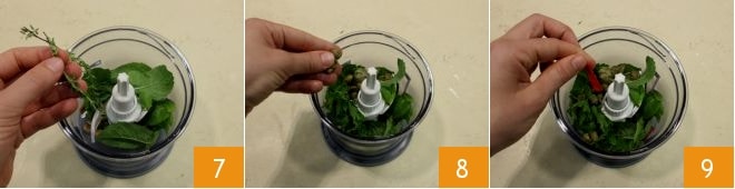 Place the mint leaves, thyme 7, parsley, capers, walnuts 8, and chili pepper 9 in a food processor.