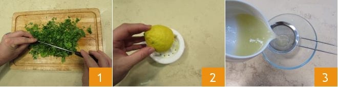 To prepare swordfish in salmoriglio, start with the marinade: rinse and thoroughly dry the parsley, then finely chop it 1 and set aside. Cut the lemon in half and squeeze out the juice 2, filtering it through a fine mesh strainer 3: you should get about 130 ml (approximately 4.4 oz).