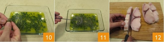 Also, add the oregano leaves 10 and whisk the mixture again vigorously with the flat whisk 10: you should obtain a homogeneous emulsion. At this point, cut the swordfish into slices about 1 cm (approximately 3/8 inch) thick 12: you should get about 4 slices, each weighing around 4.2 oz.