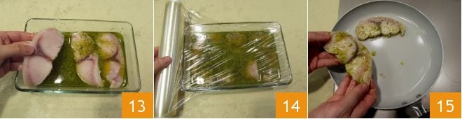Transfer them to the bowl with the marinade, ensuring they are completely covered 13, and cover with clear plastic wrap 14. Place in the refrigerator and let marinate for at least 1 hour. After the necessary time has passed, remove the fish from the fridge, discard the plastic wrap and let the swordfish fillets drain (do not discard the marinade: you will need it later). Then place them onto a preheated pan 15