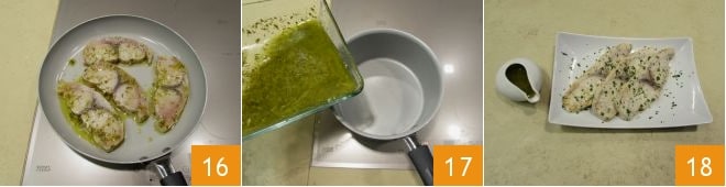 and cook the fillets for 4-5 minutes over low heat, turning them only once 16: they should be lightly golden on each side. Meanwhile, pour the marinade (salmoriglio) into a non-stick saucepan with high sides and cook it for about 5 minutes over low heat 17: this way you will reduce the marinade, making it thicker and richer. At this point, both the swordfish and the marinade will be ready: place the swordfish slices on a plate and serve your swordfish in salmoriglio with a jug containing the marinade 18!
