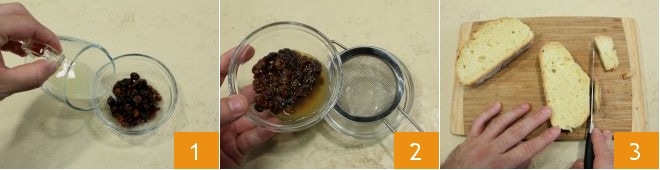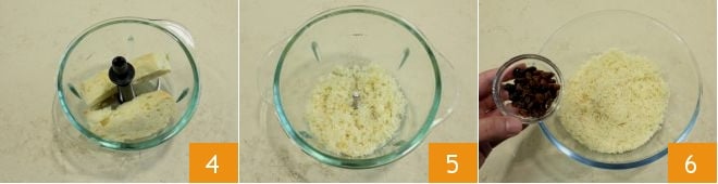 place the crumbs in a blender 4 and finely chop them 5, then pour them into a bowl and add the previously drained raisins 6.