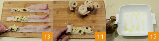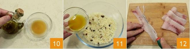 Take back the soaking liquid, add 0.68 fl oz of olive oil 10 and mix it with the filling 11. Take the swordfish slices; you can ask for slices approximately 4-5 mm thick at the fish market, or you can cut them yourself from a single fillet using a filleting knife or alternatively use a slicer. Then remove the skin from the swordfish slices 12