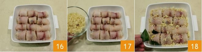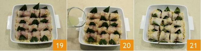 arrange the rolls close together with the opening side down 16. Sprinkle the surface with the leftover filling 17, then place bay leaves between each roll as if they were little wings 18.
