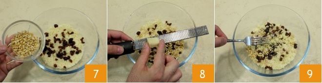 Add the pine nuts 7 and grate the fresh ginger 8, salt and pepper to taste, then mix all the ingredients 9