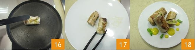 Turn the rolls to brown all sides evenly 16: it will take 2-3 minutes in total. Place the cooked rolls on a serving plate using kitchen tongs so as not to pierce them 17, then complete with mango sauce and the basil leaves you had set aside: your swordfish rolls with mango sauce are ready to be served 18!