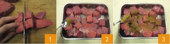 To prepare the tacos with meat, start by cutting the beef into fairly large chunks 1, then place them in a baking dish and add the ingredients for the marinade: the coriander 2 and ground cumin 3,
