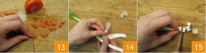 While the meat is cooking, you can prepare the tomato salad and the accompanying sauce: wash the tomatoes and cut them into very small cubes 13. Clean the spring onion by removing the root and the outer layer 14, then slice it into rounds 15.