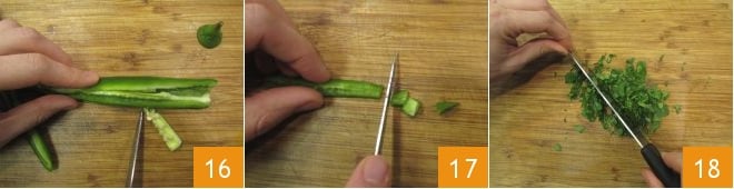 Now wash the chili, cut it in half lengthwise to remove the seeds 16, and chop it into pieces 17. Finally, chop the parsley 18