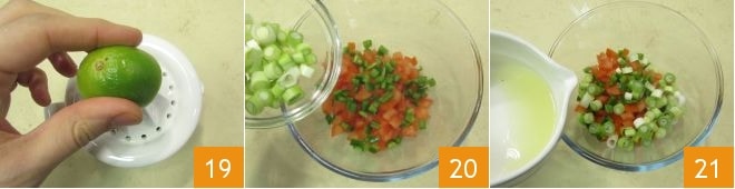 and squeeze the lime juice 19: you will need 2 tablespoons. In a bowl, combine the tomato cubes, chili, spring onion 20, lime juice 21,