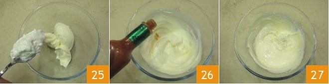 For the spicy yogurt sauce, combine the Greek yogurt with sour cream in a separate bowl 25, add a few drops of Tabasco 26, mix and place the sauce in the refrigerator until ready to use 27.