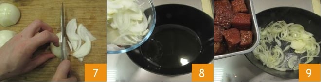 After the marinating time, take the meat out of the refrigerator and let it sit at room temperature for at least half an hour. In the meantime, preheat the oven to 392°F (convection mode), then clean and slice the onions into thin wedges 7. Heat the oil in a pan suitable for oven cooking, add the onion 8 and brown over medium heat for 5 minutes. Add the marinated meat at room temperature 9,